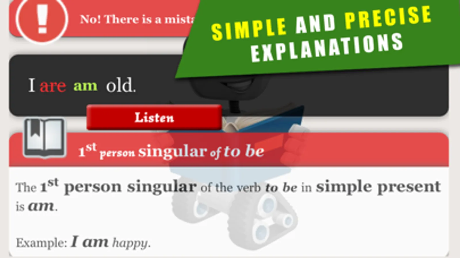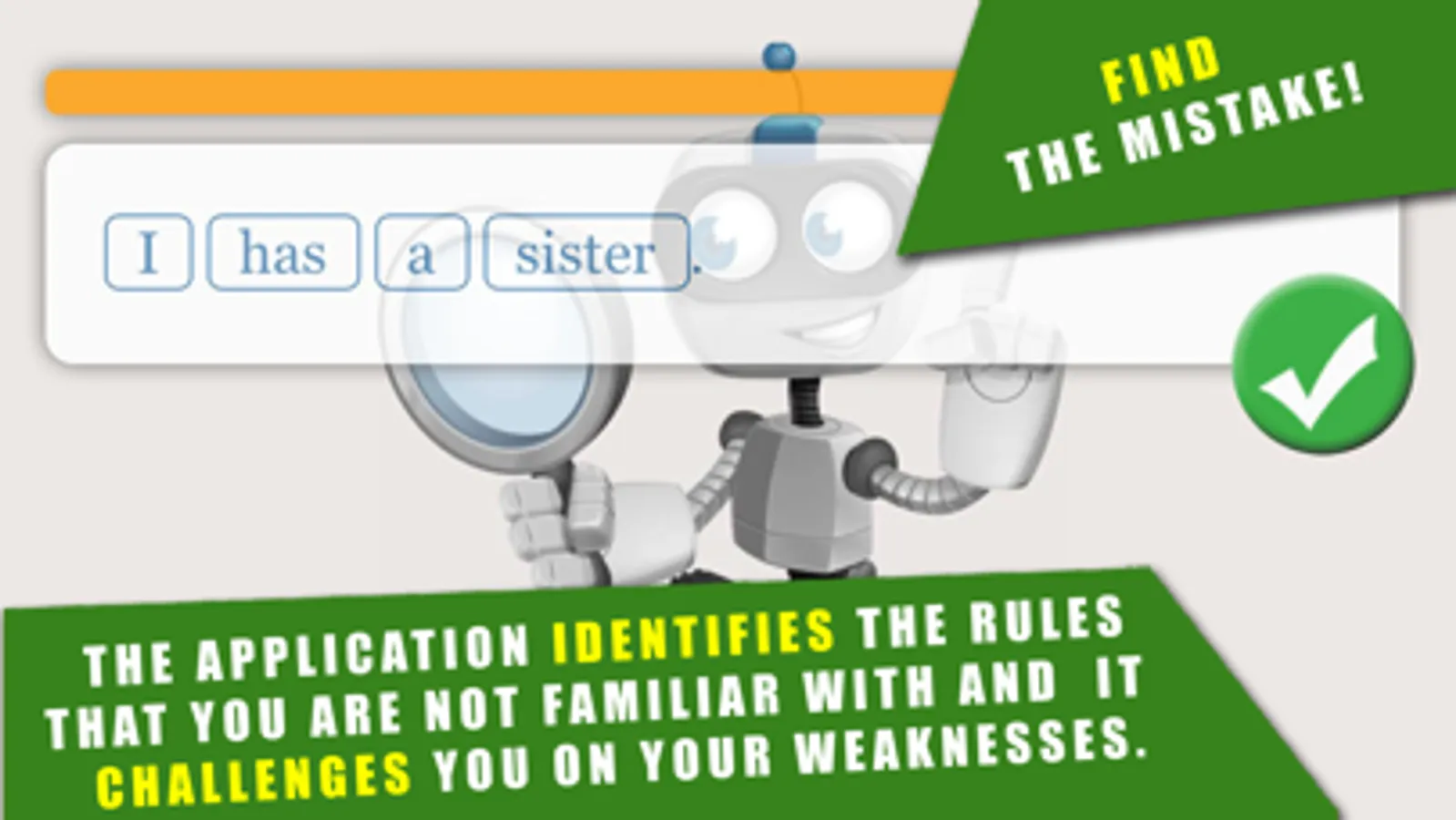 The application shows you short sentences with or without mistakes. If you identify a mistake, you point it out by clicking on the word. A small robot pops up and comments on your correct and incorrect answers in an illustrated manner. If your answers are wrong a simple and an accurate explanation will be given to you. You can then listen to the sentence and read its translation.