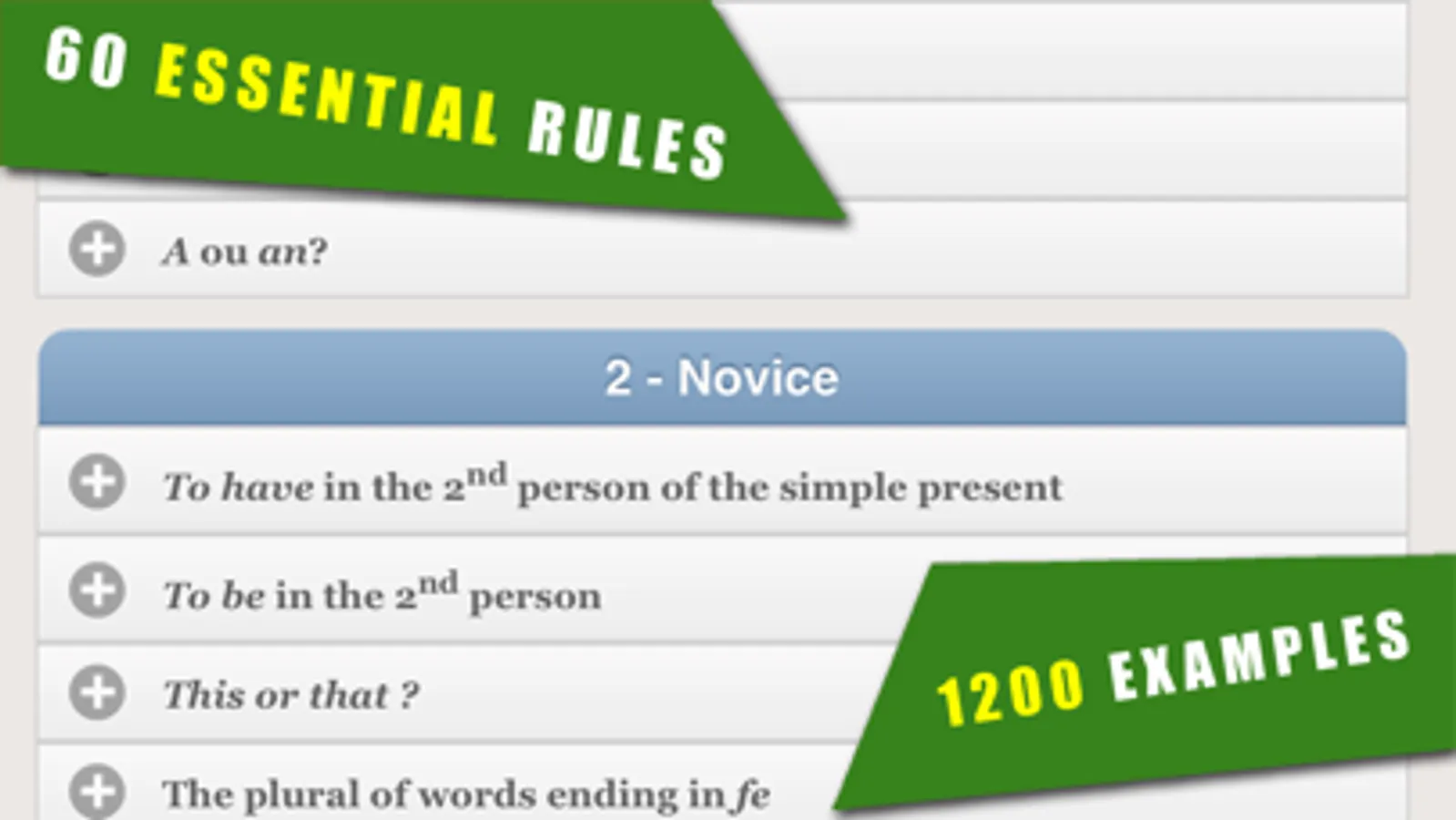 Activity is divided into twelve levels of increasing difficulty both in terms of grammar and vocabulary and it allows you to study 60 illustrated rules with 1200 examples. The total duration to complete all levels on average is 20 to 30 sessions of 5 to 10 minute games and it depends on your level.