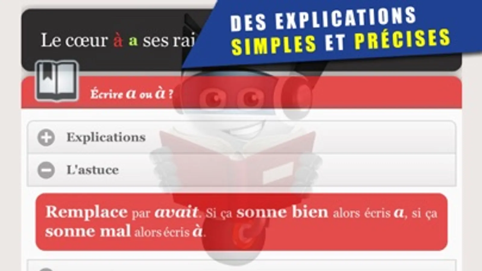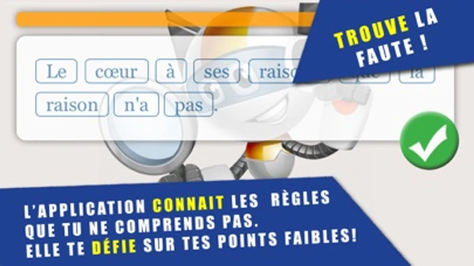 Évoluant dans une ambiance sonore et graphique dédramatisée et inspirée des jeux vidéo, l'enfant est à chaque niveau confronté à des phrases courtes avec ou sans faute. S'il identifie une faute, il l'indique en cliquant sur le mot. Un petit robot anime et commente de façon imagée ses réussites et ses erreurs. S'il se trompe une explication simple et précise lui est donnée. Les règles proposées sont volontairement pragmatiques, le plus souvent basées sur le principe de substitution par un terme équivalent afin de lever les ambiguïtés entre mots de même son ("à" ou "a" ?) et donner ainsi à votre enfant des outils simples pour mettre en évidence le sens et la fonction grammaticale des mots.
