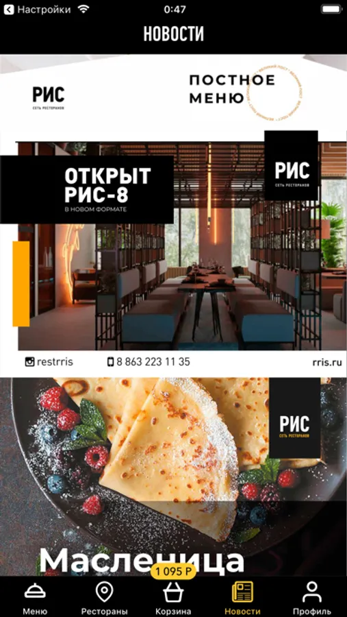 Restaurants RIS is a network of popular restaurants in Rostov-on-Don and in 6 more cities, including the most popular dishes of countries and regions of Southern Europe, Central Asia and the Far East. The application of the RIS restaurant chain is an easy and fast way to order dishes from your favorite restaurant.