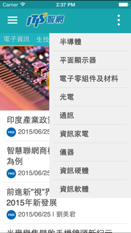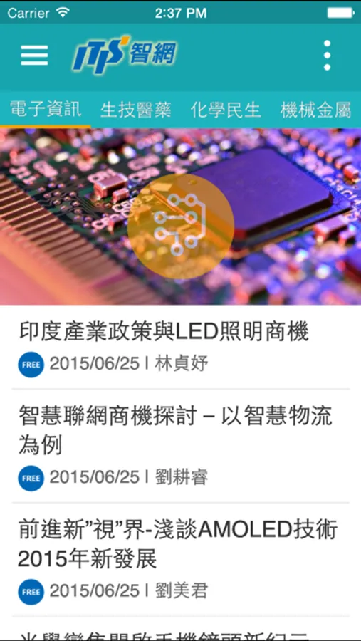 產業技術知識服務(ITIS),彙集「資策會產業情報研究所(MIC)、工研院產業經濟與趨勢研究中心(IEK)、紡織產業綜合研究所(TTRI)、生物技術開發中心(DCB)、食品工業發展研究所(FIRDI)、金屬工業研究發展中心(MIRDC)」等單位的研究成果,在ITIS智網(www.itis.org.tw)提供跨領域的產業知識查詢瀏覽服務。