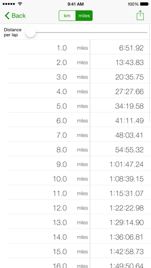 - Lap view shows total time for each lap with adjustable lap distance