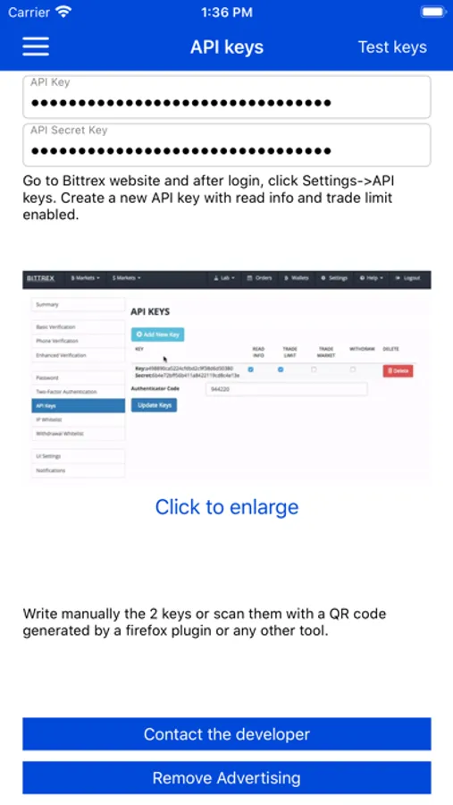 Simply enter your API keys on the configuration screen once and they are stored in a very secure way. After that, enjoy this useful application.