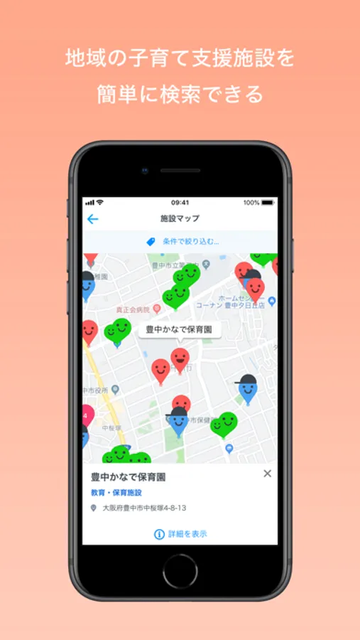 マップ上の自治体子育て支援施設やイベント実施施設が、