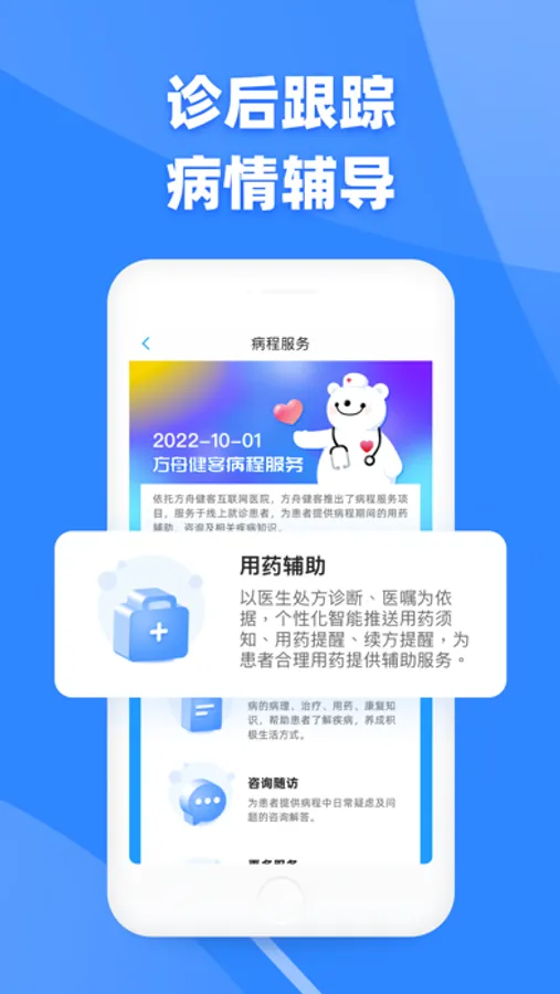 【病程服务】服务于线上就诊患者,为患者提供病程期间的复诊续方、用药辅导、健康咨询及相关疾病知识。