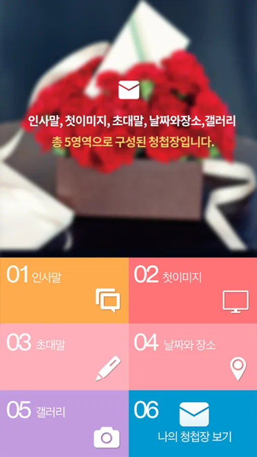 인사말, 첫이미지, 초대말, 날짜와 장소, 갤러리의 총 5영여긍로 구성된 청첩장입니다.