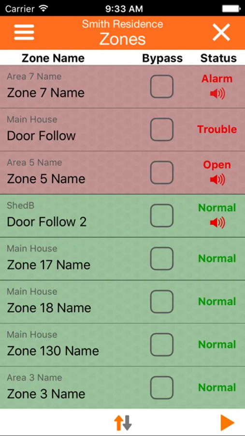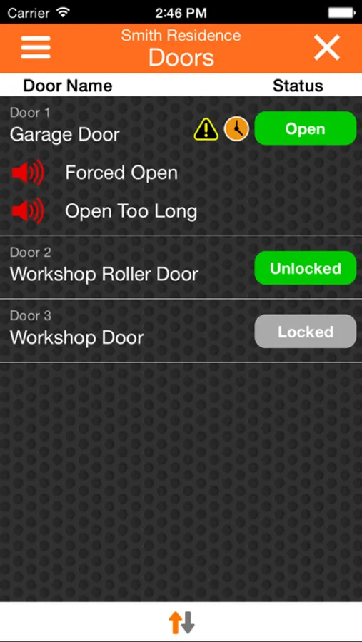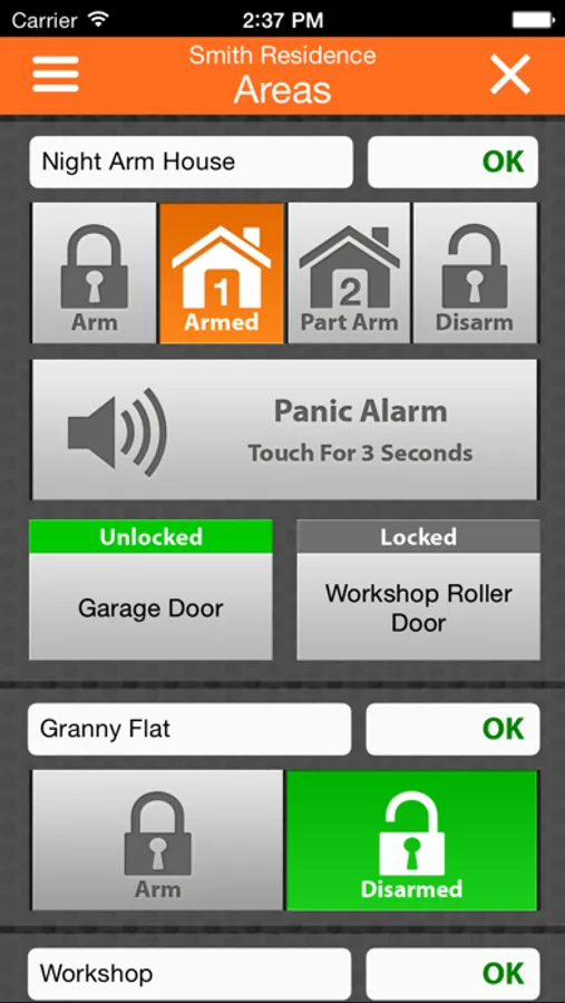 Multiple sites are supported allowing easy interface to your home, office and holiday house etc if required, and all events performed via the app are recorded in the system history log for easy auditing. All user restrictions configured on the panel are enforced by the app meaning app users can only control areas and doors they have access to on the system. Selected MyAlarm service plans include the ability to report alarm events via push notification and email.