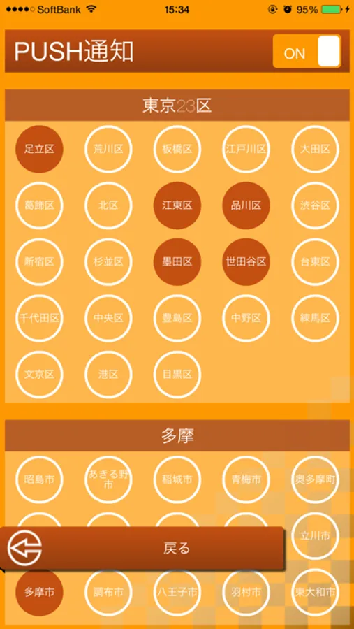 プッシュ配信は、東京都内の市区町村を設定して、お好きなエリアだけを配信することができます。