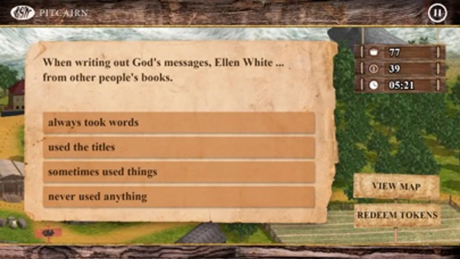 Take a journey through a 19th century village and try to earn 200 points in order to launch the Pitcairn Missionary boat and earn a Pathfinder honor (God’s Messenger Honor). You only have 7 minutes. The light colored questions earn you points. The dark colored questions give you tokens. You can trade your tokens for more time, a risk question or answer cards.
