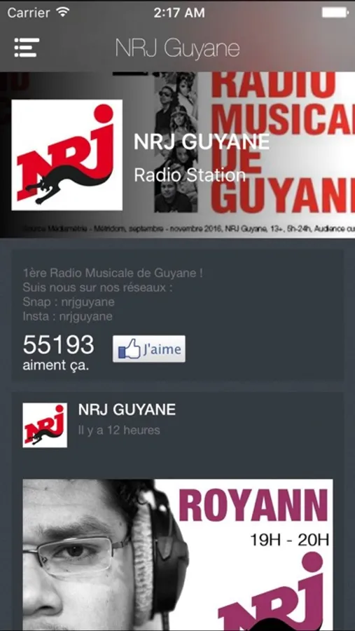 Découvre la nouvelle application NRJ Guyane. Reste en contact avec ta radio, écoute en live sur ton mobile de n'importe où, suis l'actualité de la page Facebook, de l'antenne et des photos du compte instagram de ta radio. Le Hit Music Only dans ton portable sur toute la Guyane !