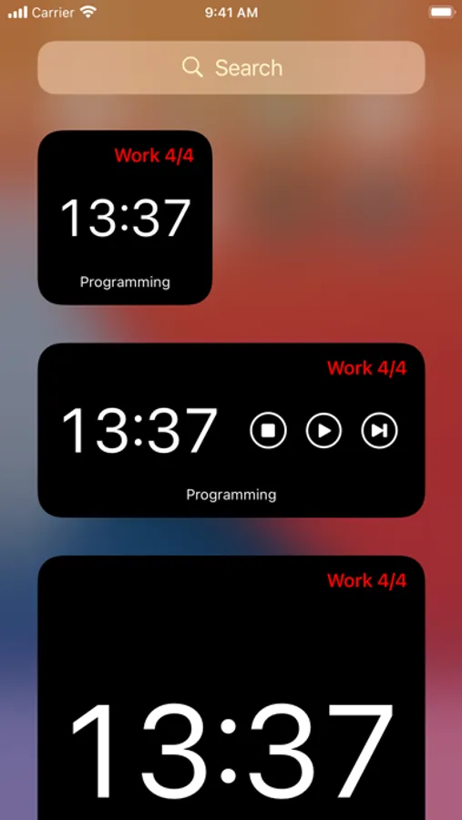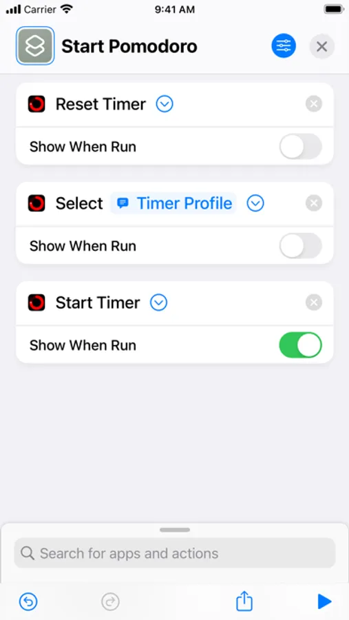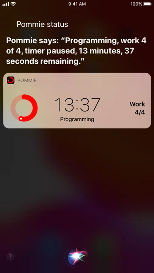 • Shortcuts run in the background without opening the app. A custom, animated, response view shows the current timer status.