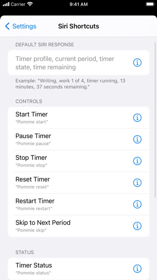 • Manage shortcuts in Pommie's settings screen, the Shortcuts app, or in the Siri & Search section of Apple's Settings app.