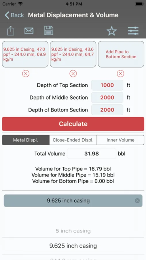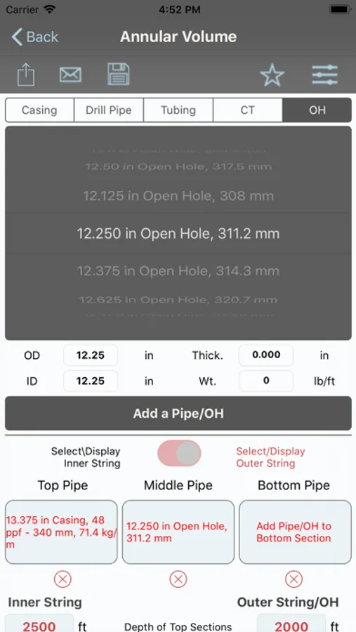 Also, the Pipes (Oilfield) App allows each of the strings to be composed of three different pipe sections and the same applies to open hole.