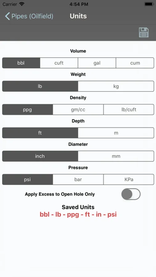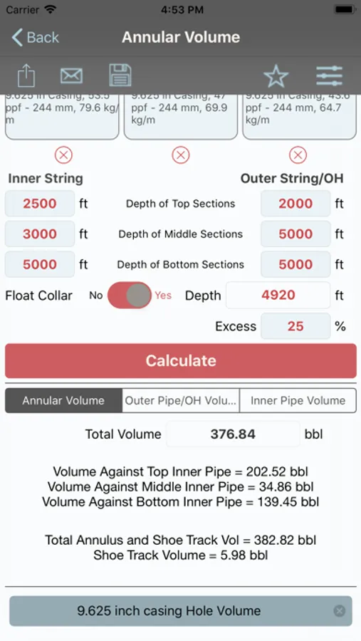 For annular volume calculations, the app allows the addition of an excess percent . This can be applied to either the open hole sections only or to open hole and outer pipe sections.