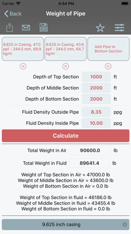 - The weight of a pipe string in air or in a fluid (the calculator allows to define a different fluid density inside and outside the pipe string).