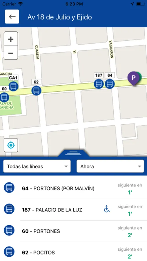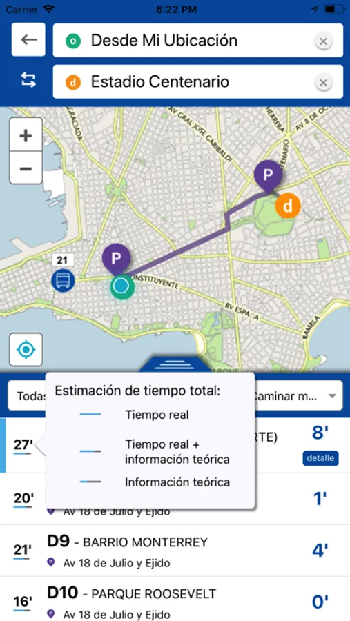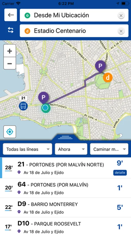 Además de los recorridos a pie o en ómnibus y todos los horarios por línea, incluye la ubicación del ómnibus en el mapa en tiempo real para todas las empresas de transporte.