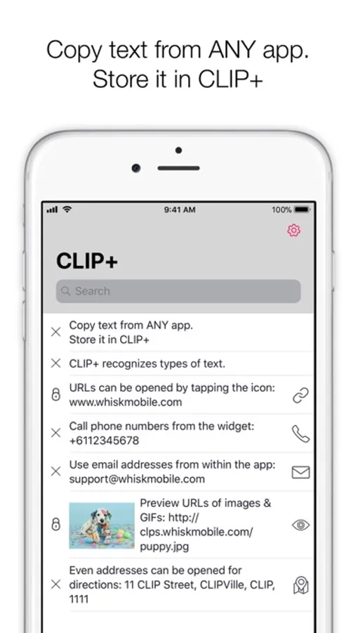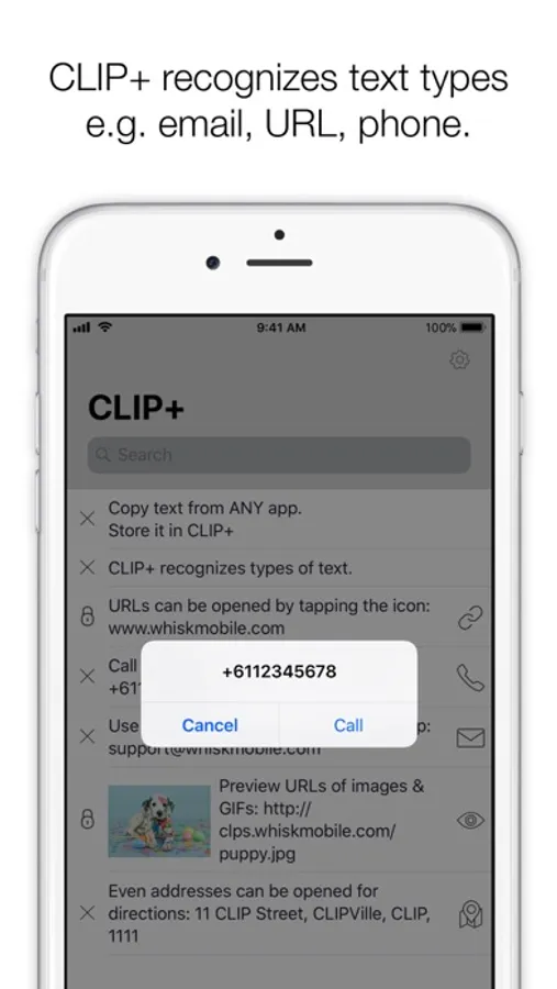 Automatically recognizes different types of content. If you copy a phone number, then call it directly from the app. If you copy a URL, then just tap the icon to go to the site. If you copy an email address, then just tap the icon to compose a new email.