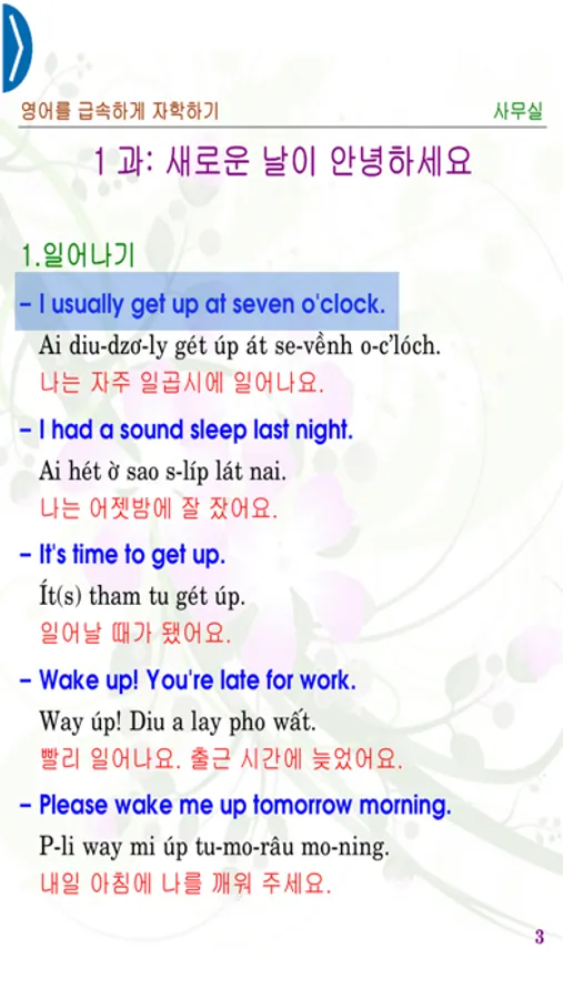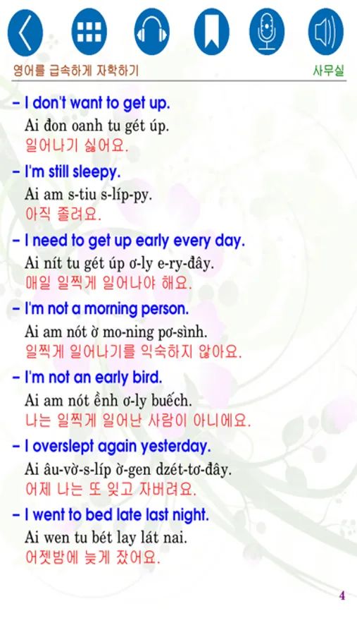 “영어를 급속하게 자학하기 - 사무실 (Office English)” 책은 141장에 포함합니다. 손에 스마트 폰을 쥘때 “언제 어디서든 영어 공부” 라고 목적으로 편찬되어 있습니다. 편찬하는 과정에서, 예기치 않은 실수들을 피할 수 없어서 본 책이 더 완료하기 위해 여러분의 귀의를 받을 수 있기 희망합니다. 진심으로 감사드립니다. 그리고 여러분이 효과적 공부하기 바랍니다. 우리의 책스마트-아이북을 사용할때 편의들: 일반적으로 책(전통책)보다 더 쌉니다. 여러분은 한번에 아이북을 지불할 것입니다. 그다음에 최신의 책을 새롭게 할때 모든 권리를 받을 수 있습니다. 동시에 돈을 더 내지 않고 영원히 사용할 수 있어서 잃어버리거나 찢어지는 것에 걱정하지 않습니다. 책은 음성(audio)이 통합되며 읽을때 각 문장을 표시합니다. 그래서 다시 듣고 싶을때 그 문장에 손대하면 다시 듣기 위해 기성발할 것입니다. 또는 아이북도 발음을 녹음할 수있습니다 (읽기 연습하는 발음). Icon Micro (Icon Recorder)를 누르는 방법으로 실현할 수있습니다. Icon Headphone (Listen and write – 듣고 쓰기)를 누를때 기능 많은 화면을 나타날 것입니다. 그래서 여러분은 듣고 자판이나 손으로 듣은 문장을 다시 쓸 수있습니다. 이것은 디지털 시대에서 우리의 획기적인 한 발명입니다. 이 아이북은 여러분에게 외국어를 배우고 책을 편리하게 읽기를 도와 줄 것입니다.