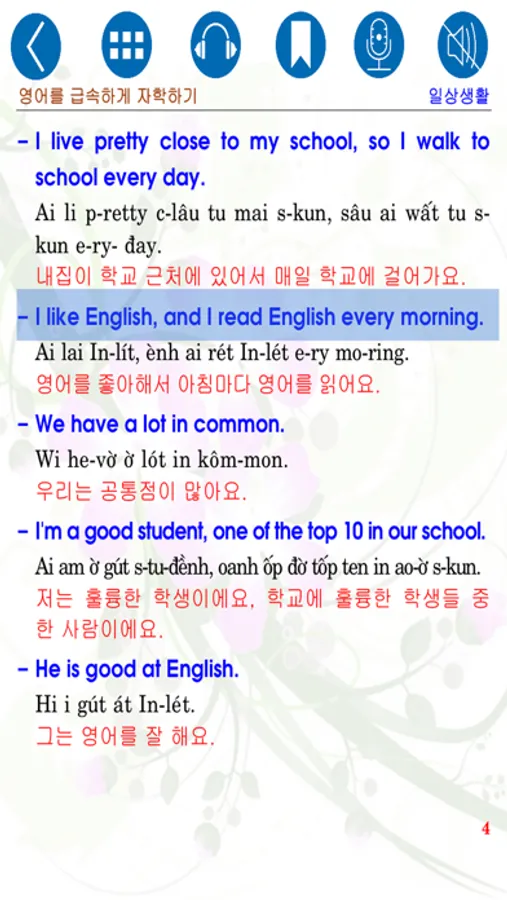 The book "Instant self-study English – Daily Life for Korean (영어를 급속하게 자학하기 - 일상생활)” includes 182 pages which are compiled according to the purpose "Learn English anytime, anywhere". Integrated - audio books (audio) mark each sentence, so when you read or listen to a sentence and want to listen again, you only need to touch the sentence and the sound of sentence will be played again; SmartBooks also has the feature of recording your voice (your voice reading the learning sentence) by clicking the icon Micro (icon Recorder), when you click on the icon Headphone (listen and write - listening and writing), screen appears with a lot of features to help you listen and write the sentence heard by key or by hand,... This is our breakthrough advance in the age of technology and it will help you a lot in learning language and reading conveniently. Smart Bookstore - TRI THỨC VIỆT