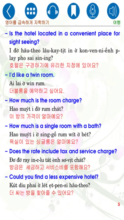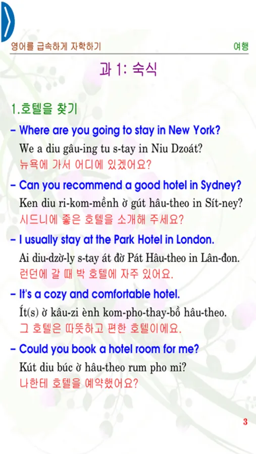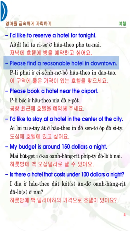 “영어를 급속하게 자학하기 - 여행 (Travel English)” 책은 143장에 포함합니다. 손에 스마트 폰을 쥘때 “언제 어디서든 영어 공부” 라고 목적으로 편찬되어 있습니다. 편찬하는 과정에서, 예기치 않은 실수들을 피할 수 없어서 본 책이 더 완료하기 위해 여러분의 귀의를 받을 수 있기 희망합니다. 진심으로 감사드립니다. 그리고 여러분이 효과적 공부하기 바랍니다. 우리의 책스마트-아이북을 사용할때 편의들: 일반적으로 책(전통책)보다 더 쌉니다. 여러분은 한번에 아이북을 지불할 것입니다. 그다음에 최신의 책을 새롭게 할때 모든 권리를 받을 수 있습니다. 동시에 돈을 더 내지 않고 영원히 사용할 수 있어서 잃어버리거나 찢어지는 것에 걱정하지 않습니다. 책은 음성(audio)이 통합되며 읽을때 각 문장을 표시합니다. 그래서 다시 듣고 싶을때 그 문장에 손대하면 다시 듣기 위해 기성발할 것입니다. 또는 아이북도 발음을 녹음할 수있습니다 (읽기 연습하는 발음). Icon Micro (Icon Recorder)를 누르는 방법으로 실현할 수있습니다. Icon Headphone (Listen and write – 듣고 쓰기)를 누를때 기능 많은 화면을 나타날 것입니다. 그래서 여러분은 듣고 자판이나 손으로 듣은 문장을 다시 쓸 수있습니다. 이것은 디지털 시대에서 우리의 획기적인 한 발명입니다. 이 아이북은 여러분에게 외국어를 배우고 책을 편리하게 읽기를 도와 줄 것입니다.