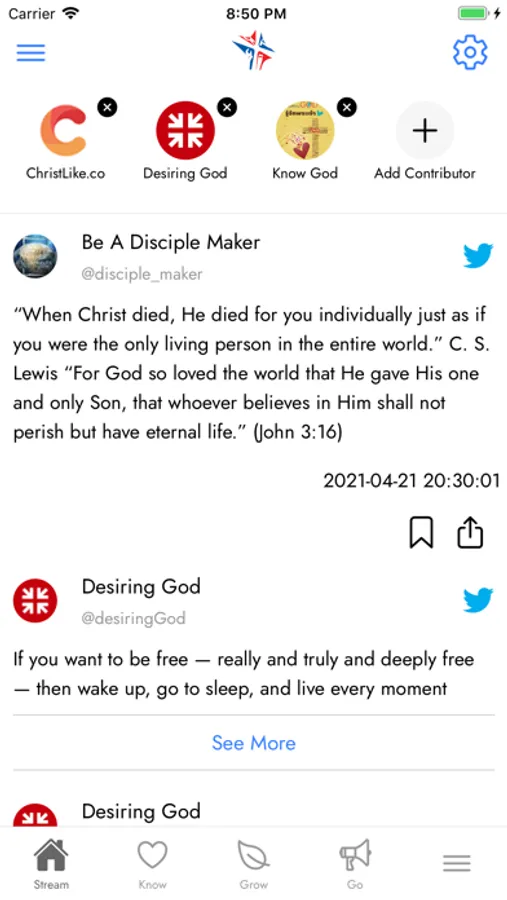 * A "Stream of Blessing" Content Feed that is updated 24/7 - with full control to select your favorite Christian content for yourself and for sharing with friends and family.