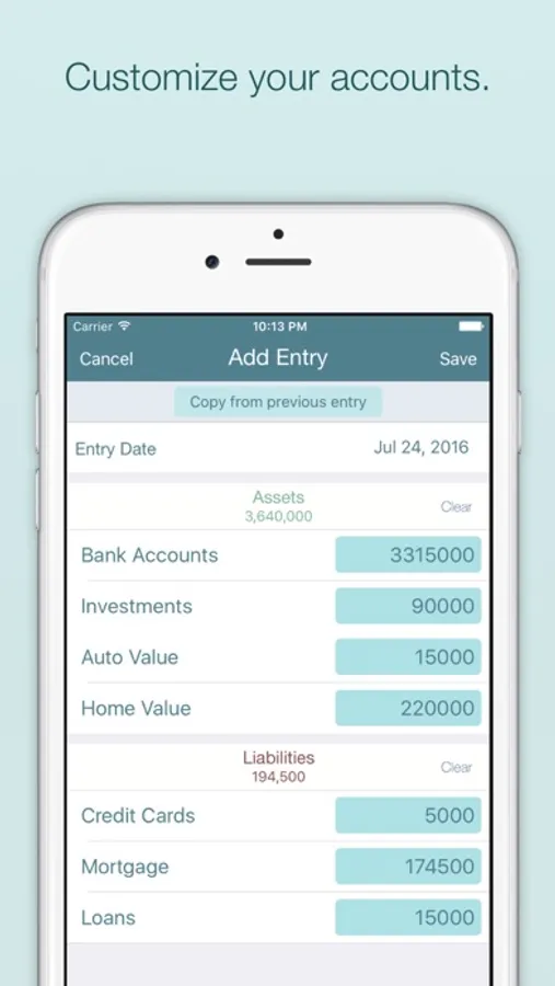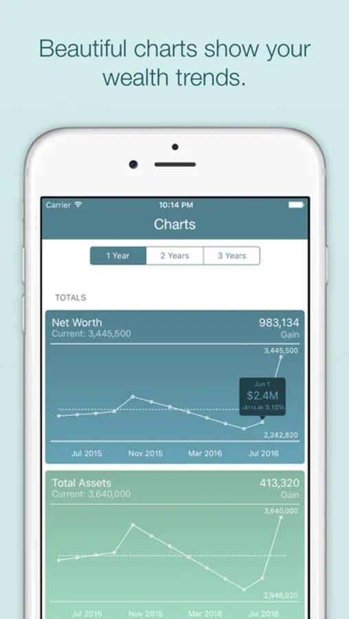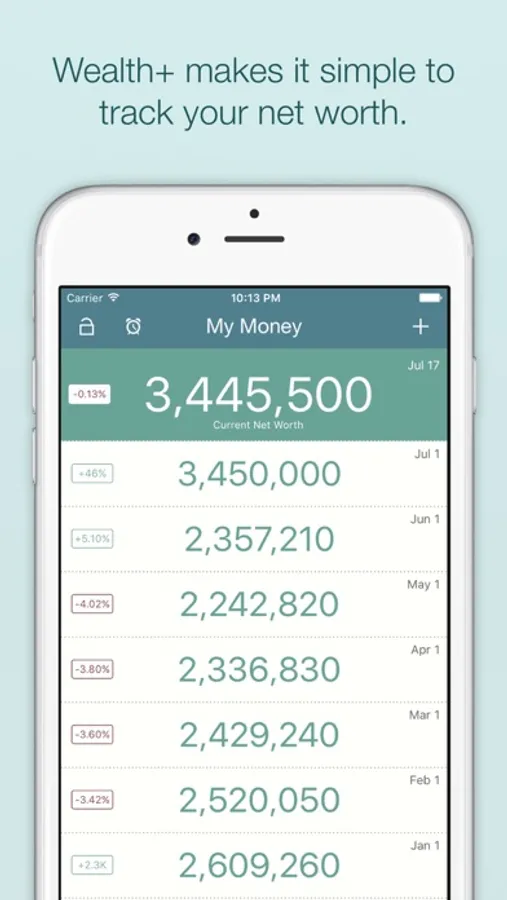 WealthPlus makes it simple to track your net worth over time. Beautiful charts let you see how your wealth is trending over a number of categories: banking, investments, auto, mortgage, loans and more. Add your own categories, too. At a glance see how your current net worth compares to last month and use it inform your savings and investment strategies. Simple and beautiful.