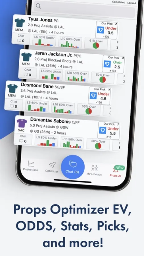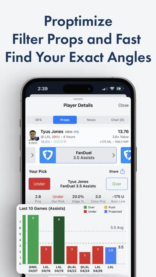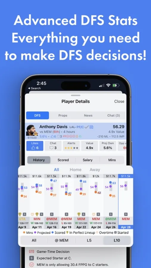 · Touch player's name to see an advanced graph of recent performance vs. our projections