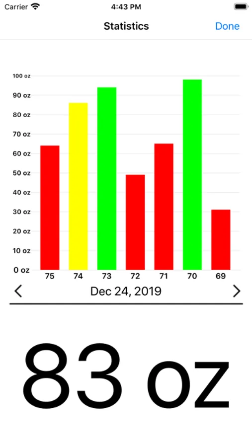 * Stats interface with color code for water intake percentage ( Red, Yellow, Green )