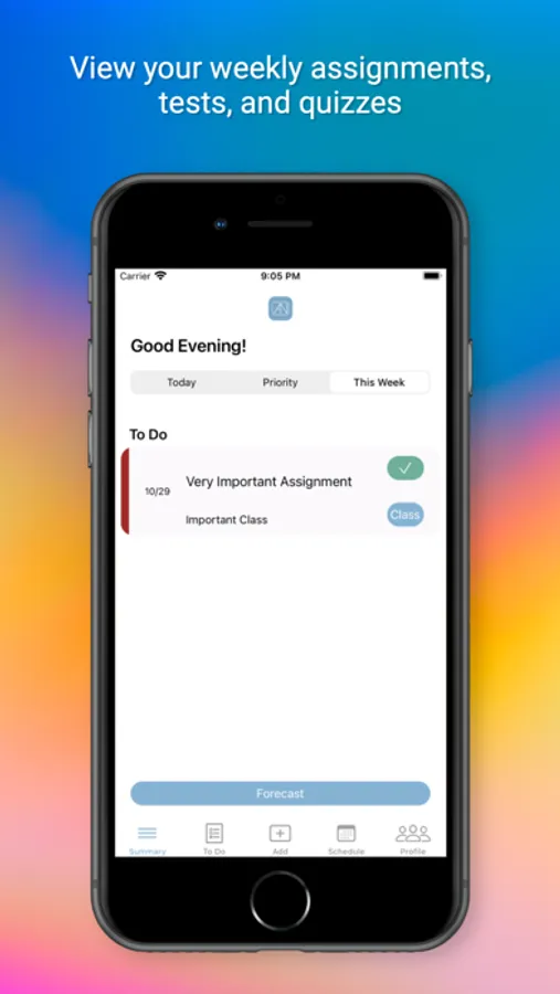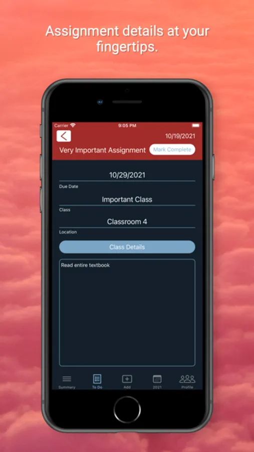 The “To Do” tab will give you the full list of all incomplete assignments, as well as quizzes and tests that are upcoming. You can edit these listed items directly from this tab, or add new ones from the “Add” tab. If you tap on an assignment, test, or quiz, you will be taken to the detail screen that gives you all relevant details regarding this item. Details such as when the item is due, when it was assigned, or any relevant notes or class details you may have provided when creating the assignment.