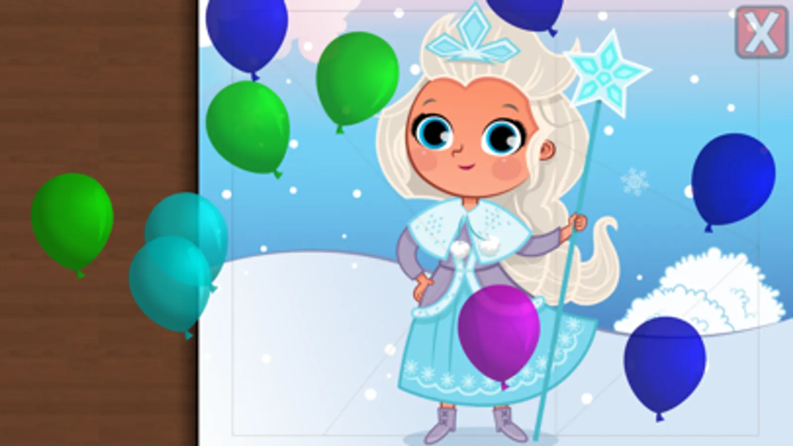 A fun puzzle game for toddlers and kids from ages 1 to 6 featuring many cute cartoon fairy tale figures such as a forest fairy and her animal friends, a mermaid and her underwater friends, the ice queen, alice playing tea party, a fairy riding her unicorn pony and more in 29 shape & tangram puzzles!