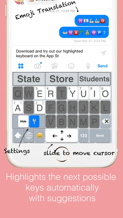 Translate the word that you select in the suggestion bar into Emoji characters. It is a fun way to communicate with your friends and family. It is disabled by default and you need to use the "Keyboard Setting" page to enable this feature.