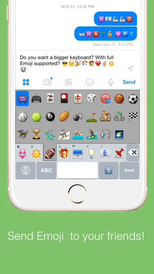 It is very convenience to input Emoji characters with this keyboard when you are using Facebook, Twitter, iMessage, Wechat, Text Message, SMS, etc. Just long press on the key that has sub-menu and more Emoji characters will pop up. The Emoji characters are well categorized and you can input the Emoji and Text together in one keyboard!