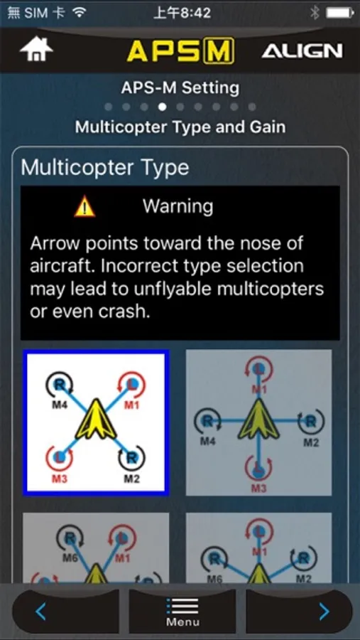 ・Supports 6 multicopter configurations: 4 rotors+, 4 rotors X, 6 rotors+, 6 rotors X, 8 rotors+, 8 rotors X.