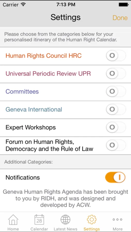 This application will be based on public information, which is available in several websites. The advantage will be that through this app users will get the information directly into their mobile devices without using their time searching that information on different websites. Push notifications and sharing features within the app will contribute to maximize time and efforts of delegations and representatives interacting in the field of human rights in Geneva.