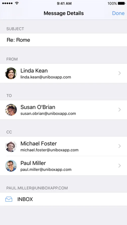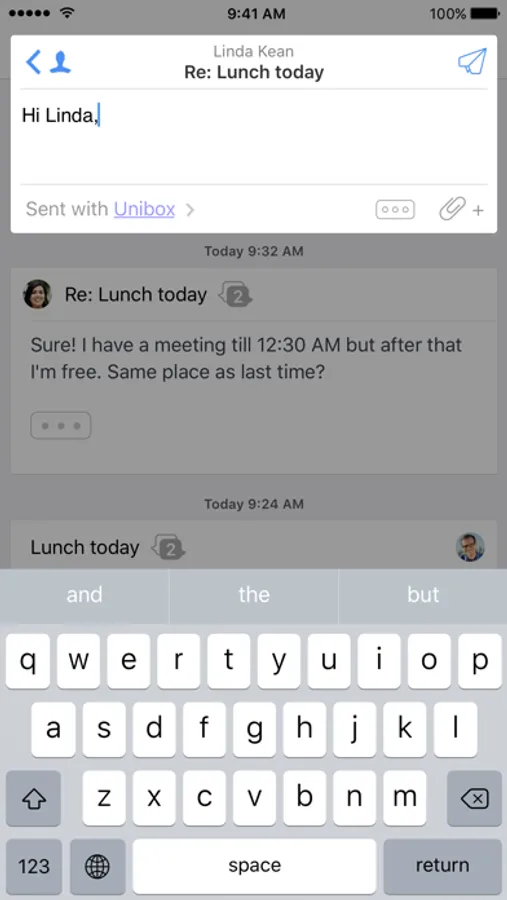 With Unibox your inbox is always cleaned up. You navigate through your emails by sender. With a single tap you can see all messages and attachments you exchanged with a person in one place. And with a single swipe you can get rid of dozens of newsletters and notifications of the same sender that you don't need anymore.