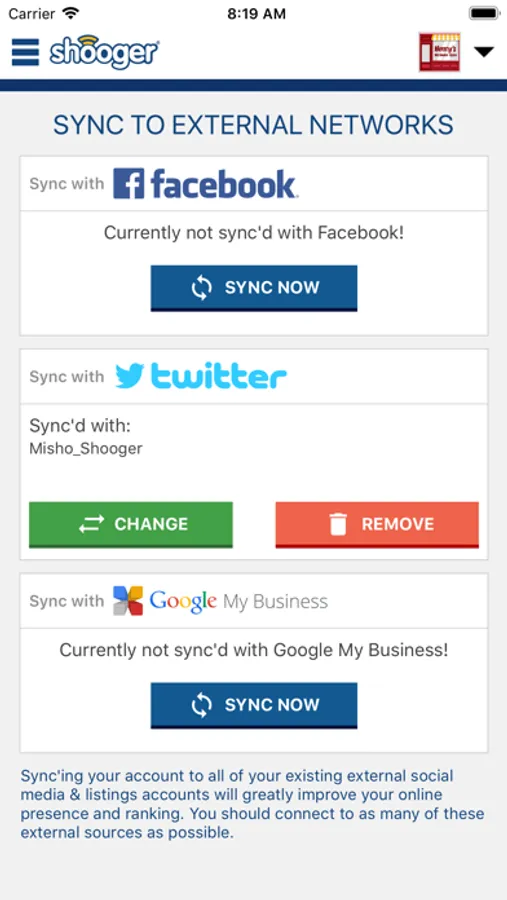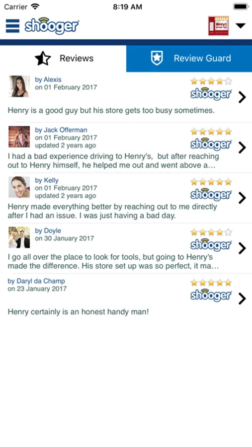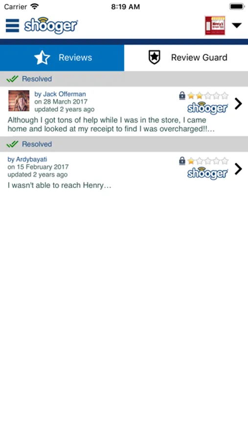 Participating Shooger Merchants can use this app to check reviews about their business from over 2000 digital review sources. Get notified instantly when someone posts a sub-par review on Shooger and then use Shooger's instant customer chat screen to resolve your unhappy customer's concern thereby increasing your chance of getting only positive reviews.