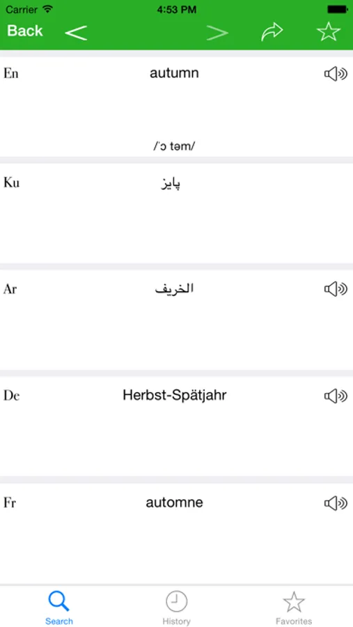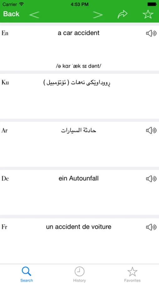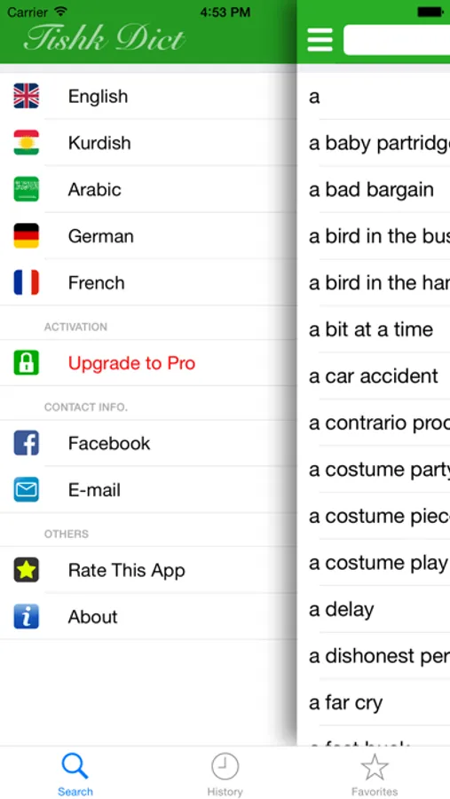 This dictionary includes 50,000 words with (( English-Kurdish-Arabic-German-French )) meanings.WORKS OFFLINE - no Internet connection needed when searching words.