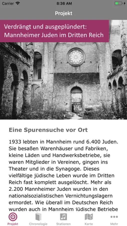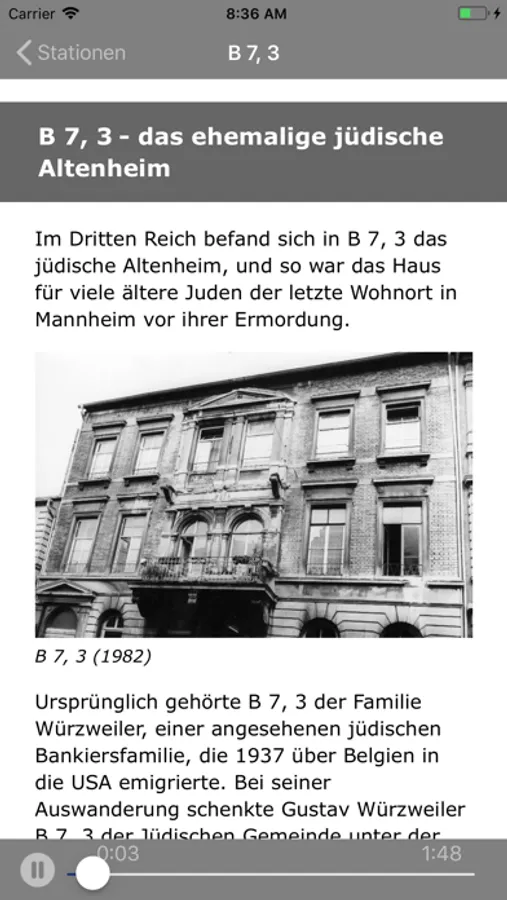 Der Bild- und Audiowalk „Verdrängt und ausgeplündert“ lädt Sie zu einer Spurensuche in der Mannheimer Innenstadt und der Neckarstadt West ein. Mit der vom Stadtarchiv Mannheim - Institut für Stadtgeschichte konzipierten App können Sie die jüdische Geschichte der Stadt vor Ort kennenlernen. Suchen Sie sich selbst Ihren Weg entlang der verschiedenen Stationen und hören oder lesen Sie, welche Geschichten sich hinter einzelnen Orten und Gebäuden verbergen.