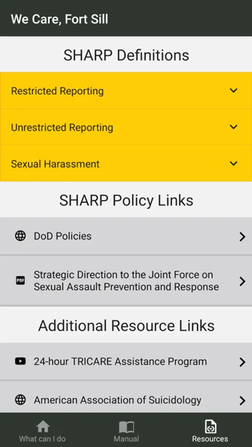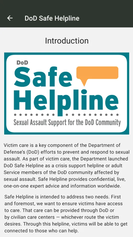 This app is to support the TRADOC Sexual Harassment/Assault Response and Prevention (SHARP) campaign plan which is designed to reduce with the goal of eliminating sexual harassment and sexual assault from our ranks. This is one of many initiatives developed to ensure that every member of our TRADOC family serves in a safe environment, free from sexual harassment and sexual assault.