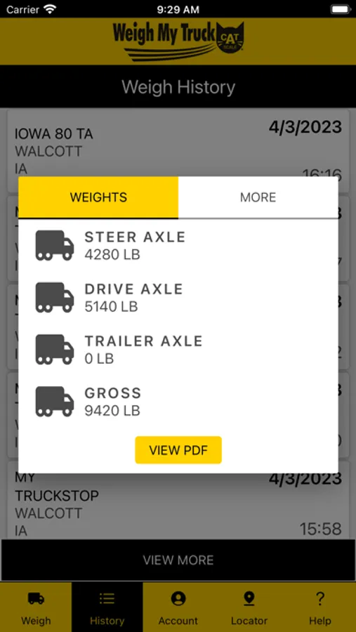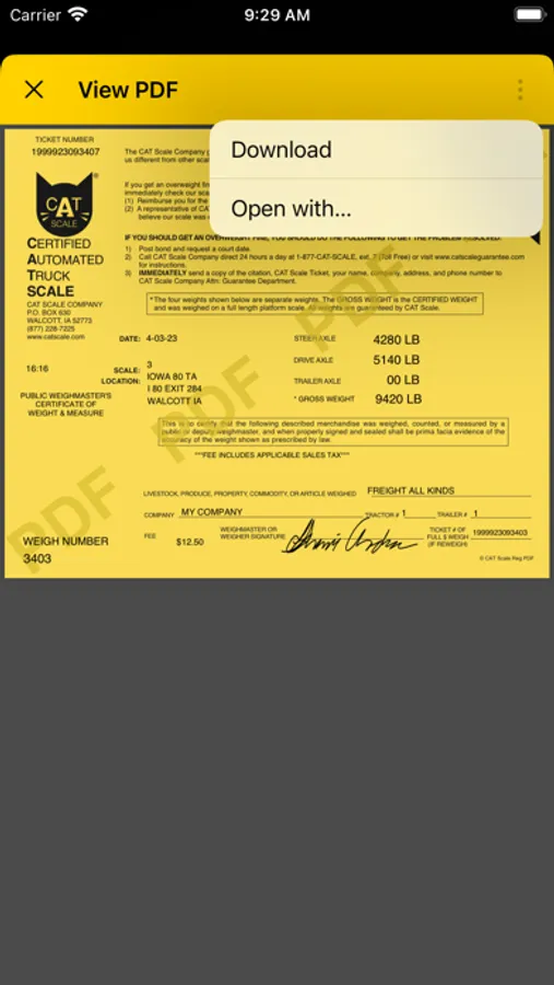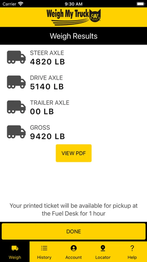 Attention Professional Drivers! Save time weighing your load! The CAT Scale Weigh My Truck app offers you the convenience of weighing your truck and paying for the weigh, all from your iPhone or iPad, while on the scale. Use the Weigh My Truck app to create an account to store your truck and trailer information as well as keep track of your weighs and receive secure PDF copies of your CAT Scale weigh tickets. Your printed CAT Scale ticket is still available for you to pick up inside after you weigh.