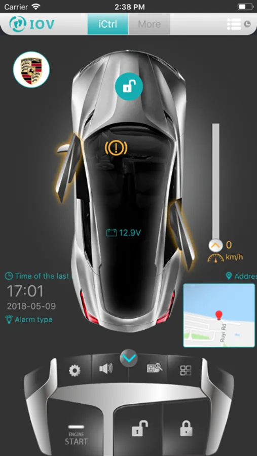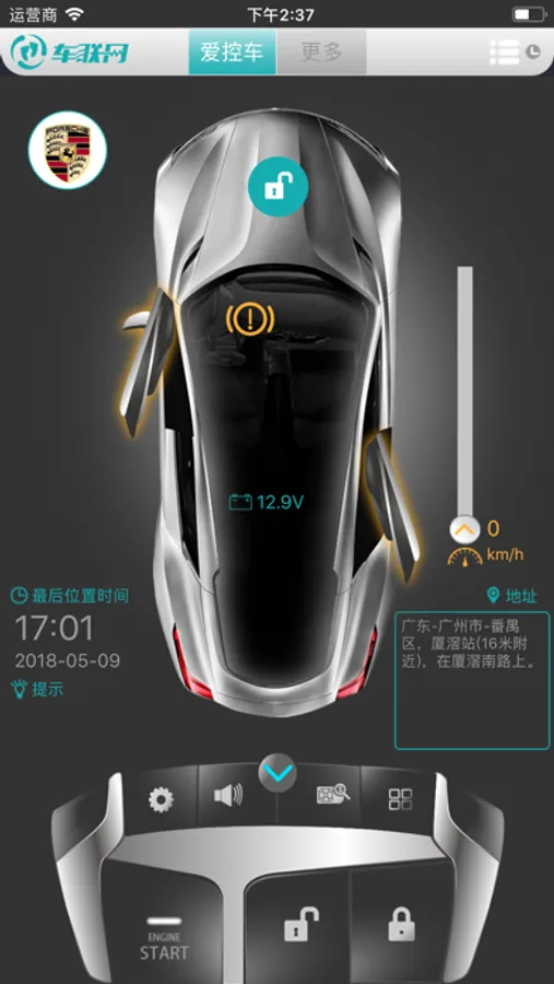 5、状态:显示实时的车辆行驶速度,车辆所在位置,车辆的设防、撤防状态,车辆启动状态,车门开关状态,还有各类报警提示内容。