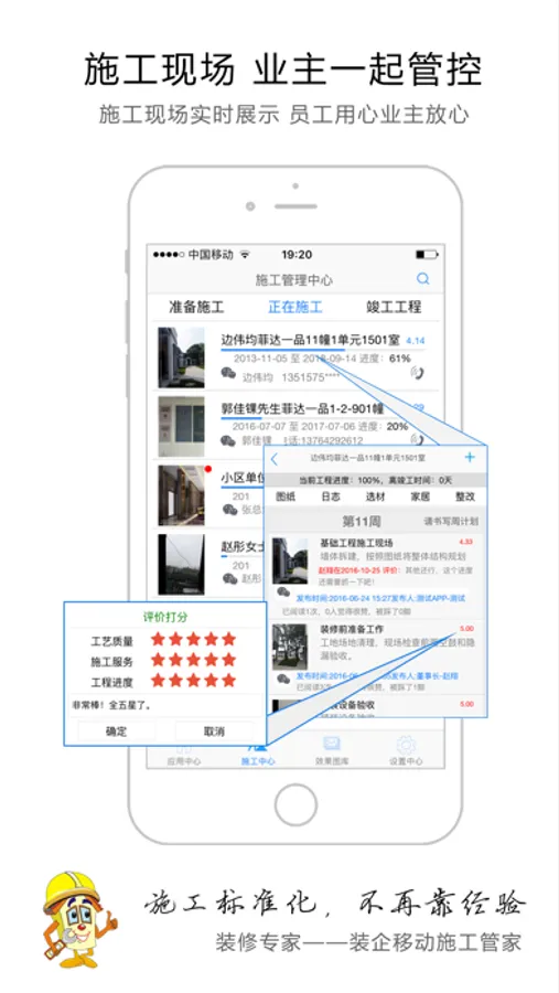 【施工管理】核心功能,合理安排施工进度,实时监视施工现场,严格执行施工标准化、流程规范化,管理科学化,施工绩效评价体系,节点验收管理及验收,对接业主精打细算我家装修APP客户端共同管理,工地实况一览无余。