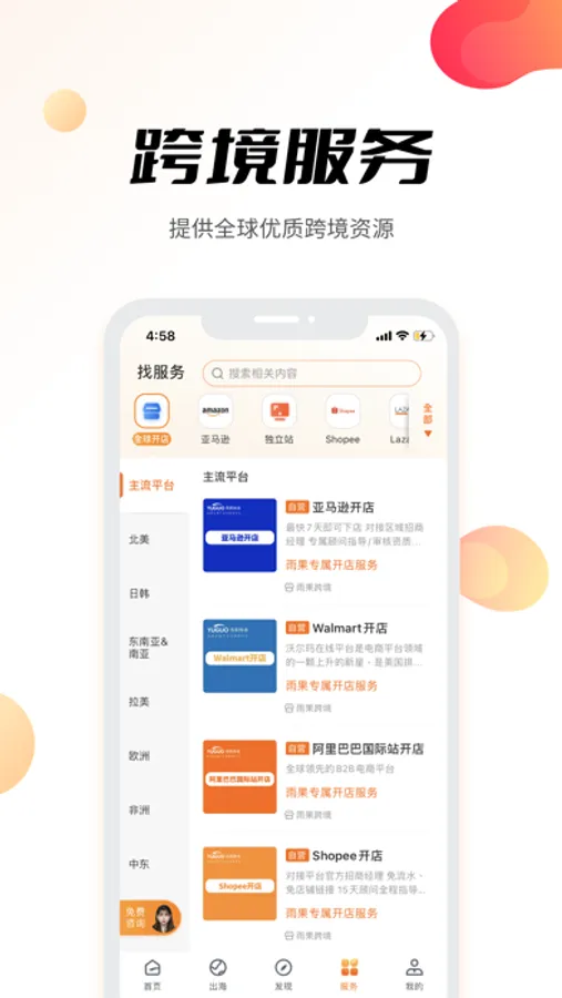 【跨境平台】:主流跨境电商平台亚马逊、速卖通、虾皮、eBay、Alibaba、Lazada 等,新兴电商平台TikTok、Temu、SHEIN、Ozon、沃尔玛、Vova、Allegro、Wayfair等优质资源,一键入驻跨境平台;