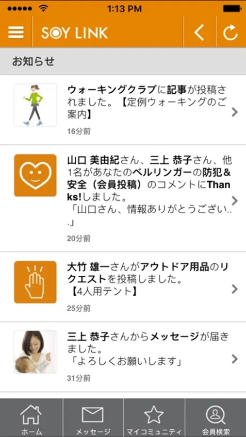 コミュニティ内の知り合いを捜したり、メッセージのやりとりをすることができます。