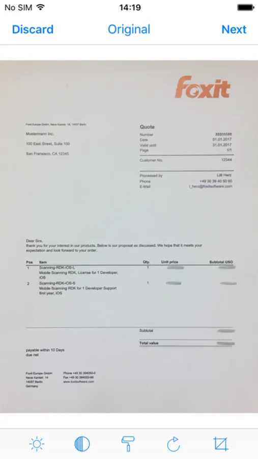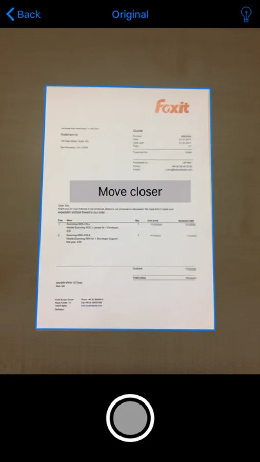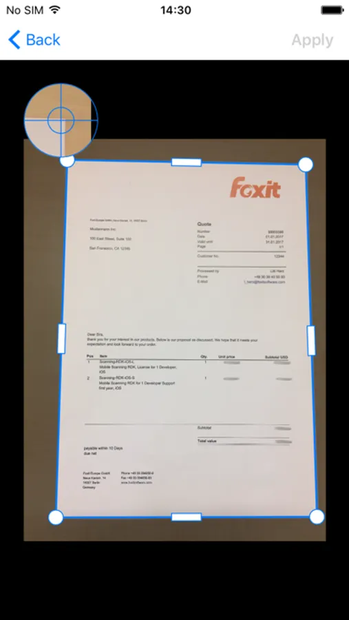 The Foxit PDF Scanner based on our mobile RDK/SDK turns your smartphone or tablet into a mobile scanner for all types of documents. The app ensures excellent single- or multi-page scans, stored as highly compressed PDF files or JPEG image sequences in the app’s document list. Documents can be immediately uploaded to a predefined cloud storage service or sent by email.