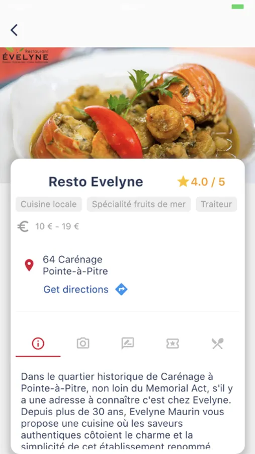 Fruit de huit années d'expérience dans l'univers culinaire et en se fiant à une équipe de testeurs aux palais divers et variés, l’ app entre vos mains présente les meilleures adresses de l’archipel des Îles de Guadeloupe.