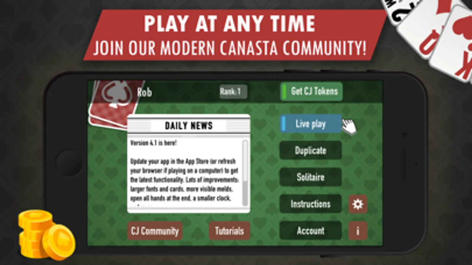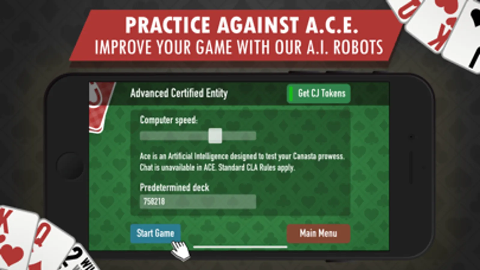 Download now our Canasta Junction app for free and start practicing with robots. Then, subscribe to Live Play and play with real people.