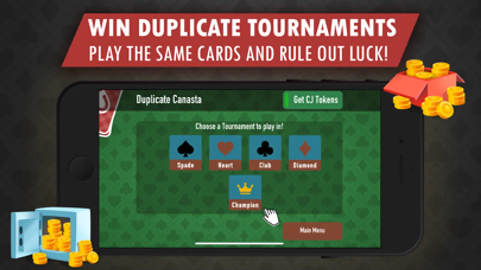 ◆ Duplicate: compete with other participants by playing the very same hands! Here is how it works: in each tournament, you play six hands against our robots, then your final score gets ranked against many other players. Tournaments are held daily. Rule out luck and show you are the King/Queen of Canasta Junction!