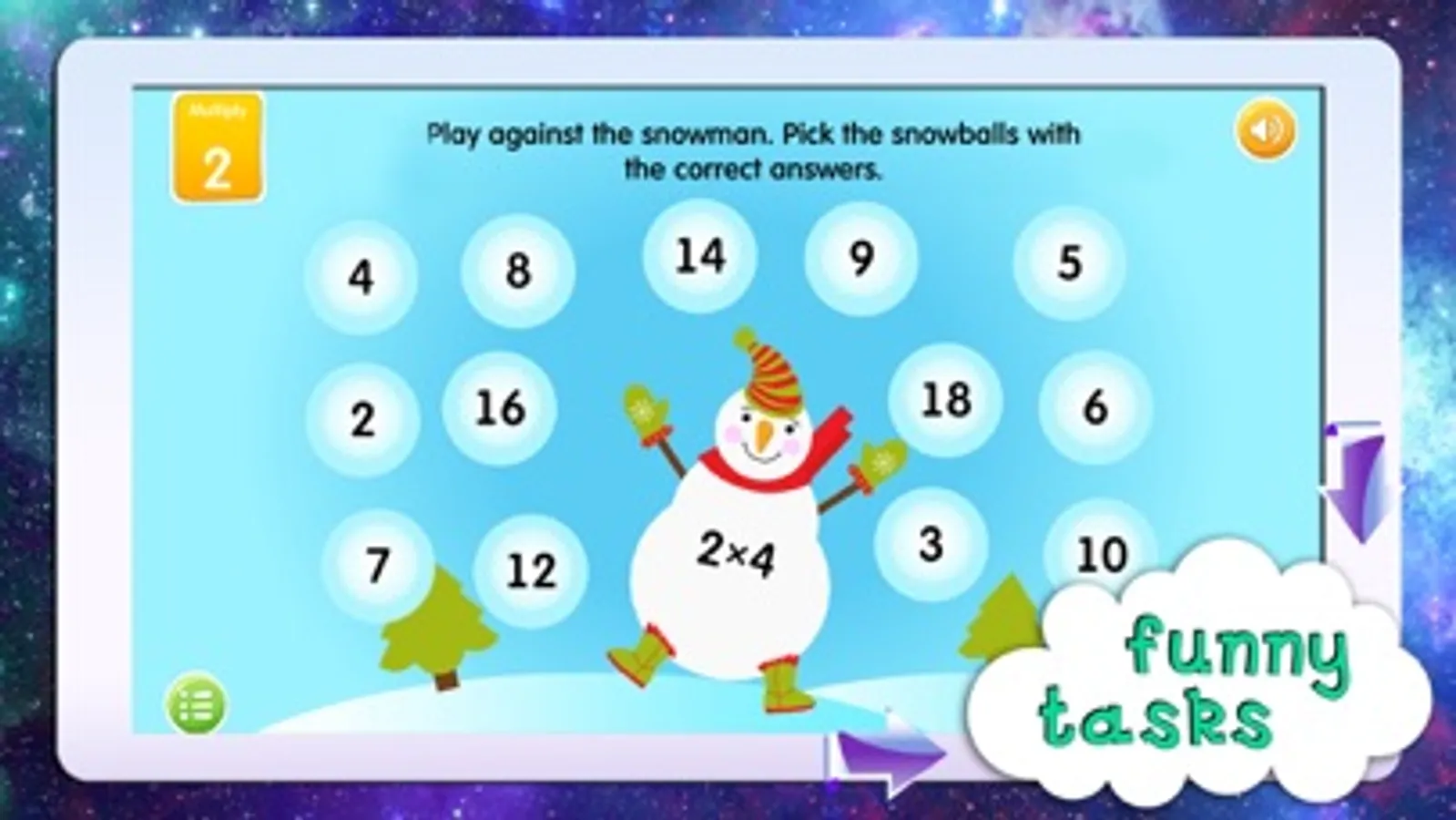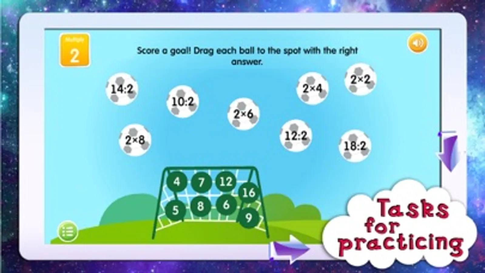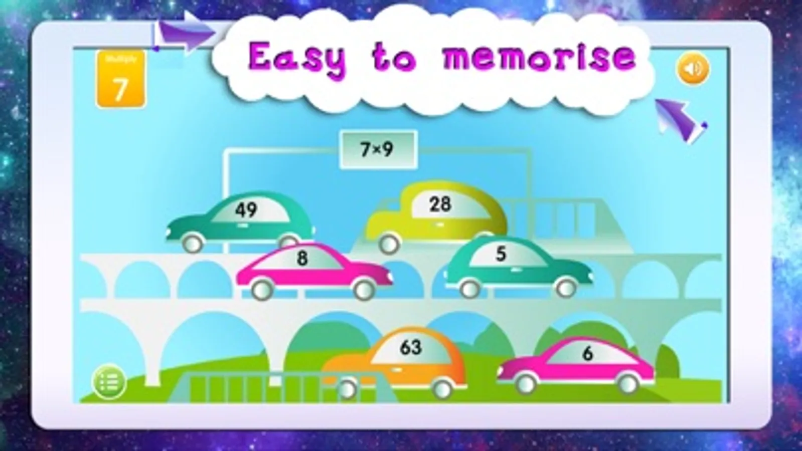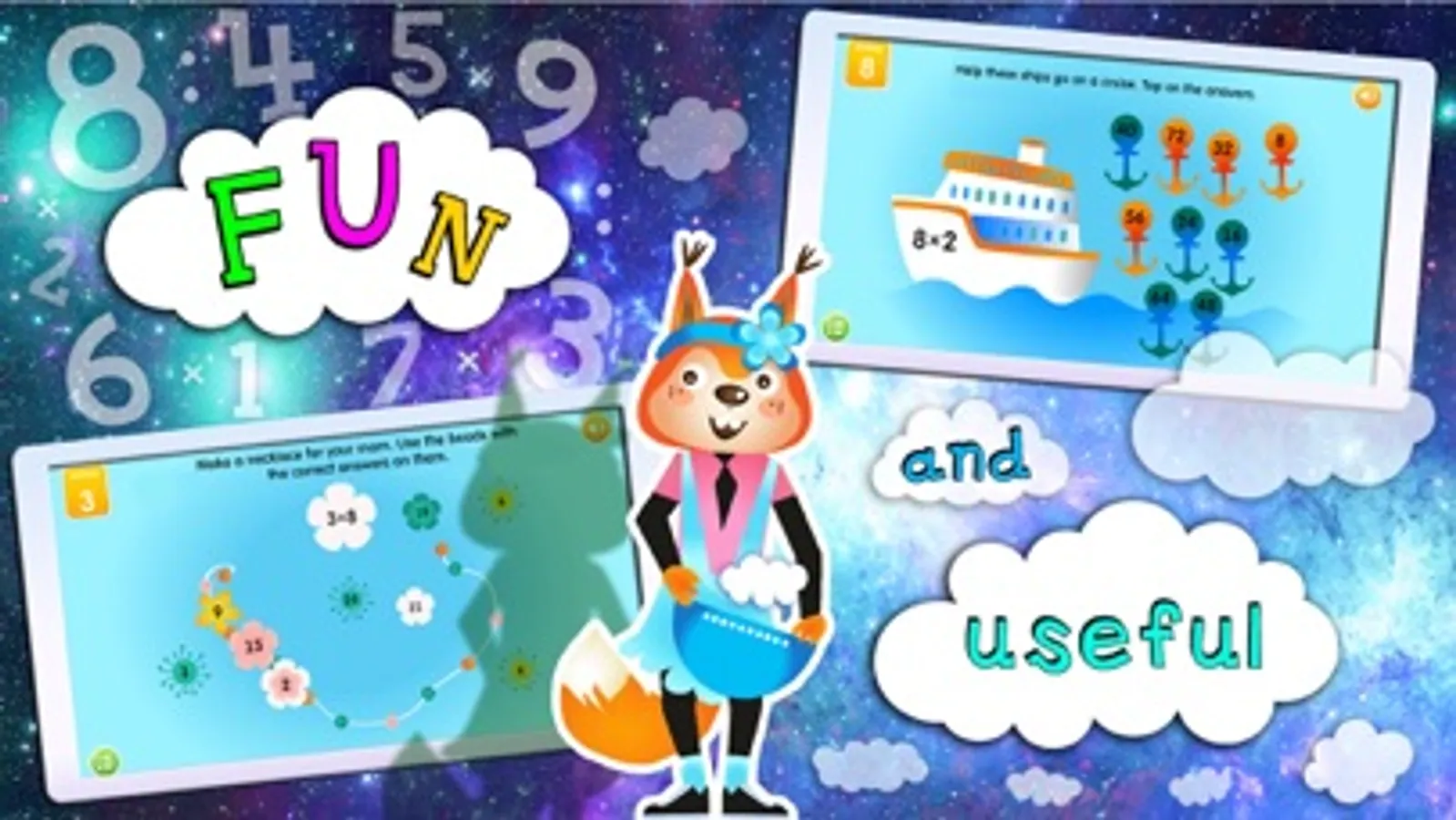 The trainer will help schoolchildren to memorize their times tables easily through series of engaging games. While playing and having fun they will master the principles of multiplication and division. Interesting game-like tasks, a special system of encouragement together with an opportunity to control and check the progress make the learning process highly effective. Light background music and sound effects turn the activity into an interesting game. The trainer was developed by a group of experienced educators with all age-specific features of 6-9-year-olds taken into account.