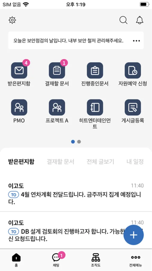 U+웍스 서비스를 모바일 기기에서 사용할 수 있도록 제공하는 전용 앱으로사용 가능한 기능은 메일, 쪽지, 전자결재, 게시판, 업무관리, 일정관리, 주소록, 자원예약 등 입니다.